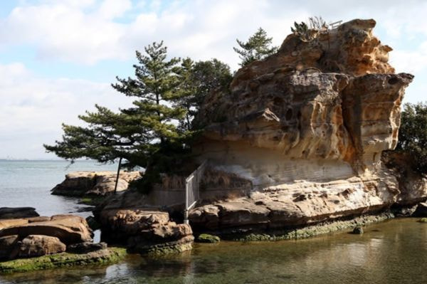 イザナギとイザナミは「天の浮橋」の上から「天の沼矛」で混沌をかき回し滴り落ちたしずくから自ら凝り固まってできた最初の島「自凝島(オノコロジマ)」に降り立って国生みを始めるわけですが、岩屋にある「絵島」にも自凝島の言い伝えが残っているんですよ。
